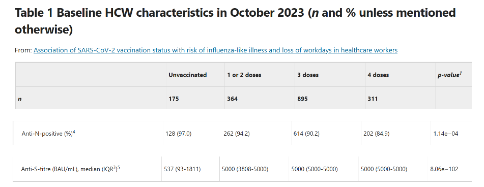 With an increased number of doses, natural immunity (as commonly measured in terms of anti-N Abs) goes down significantly (from 97% to 84.9% after 4 doses).